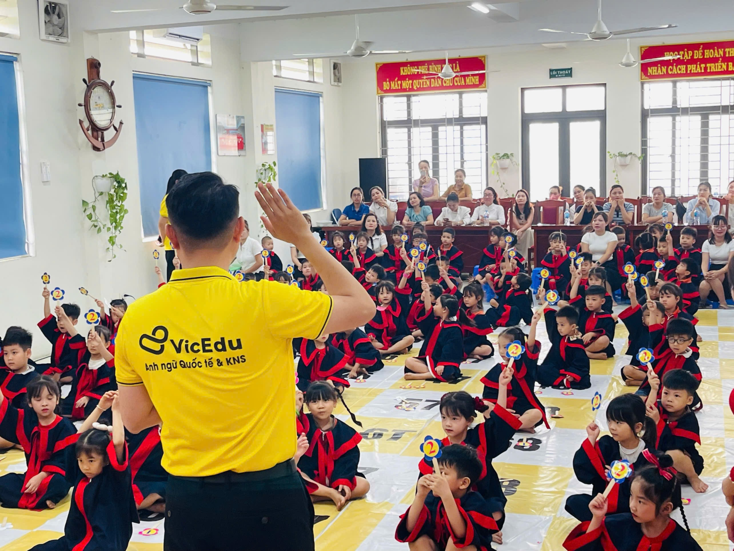 Sáng ngày 22/04/2026, Trường Mầm non Cao Dương 2 phối hợp cùng Trung tâm Anh ngữ & Kỹ năng sống Vic Edu Dân Hoà đã mang đến một sân chơi trí tuệ đầy sôi động cho các bé khối 5 tuổi qua chương trình “Rung Chuông Vàng”.
